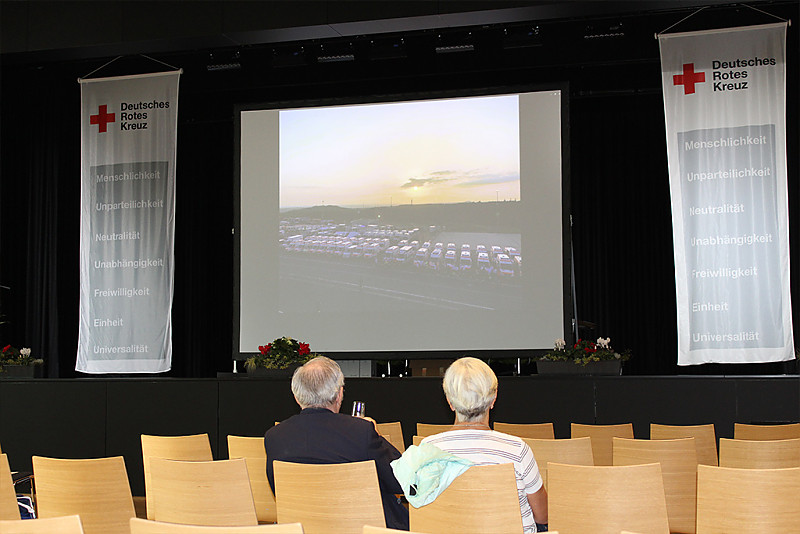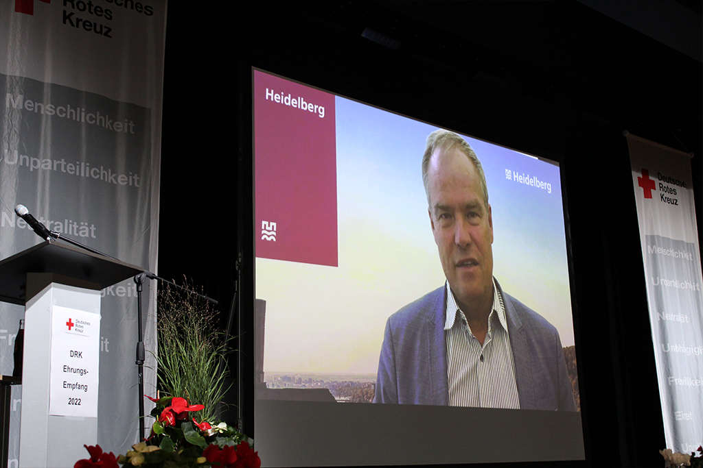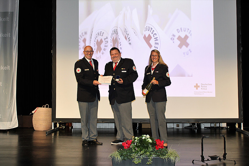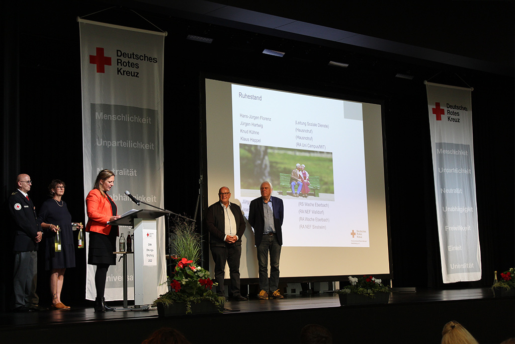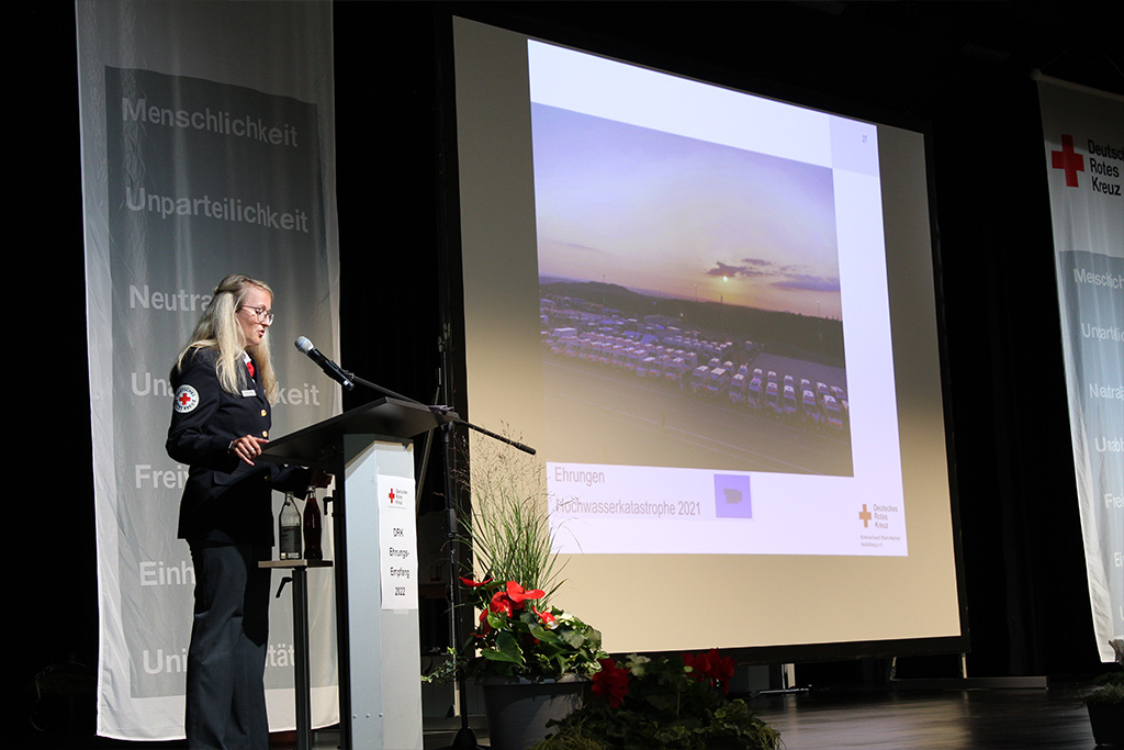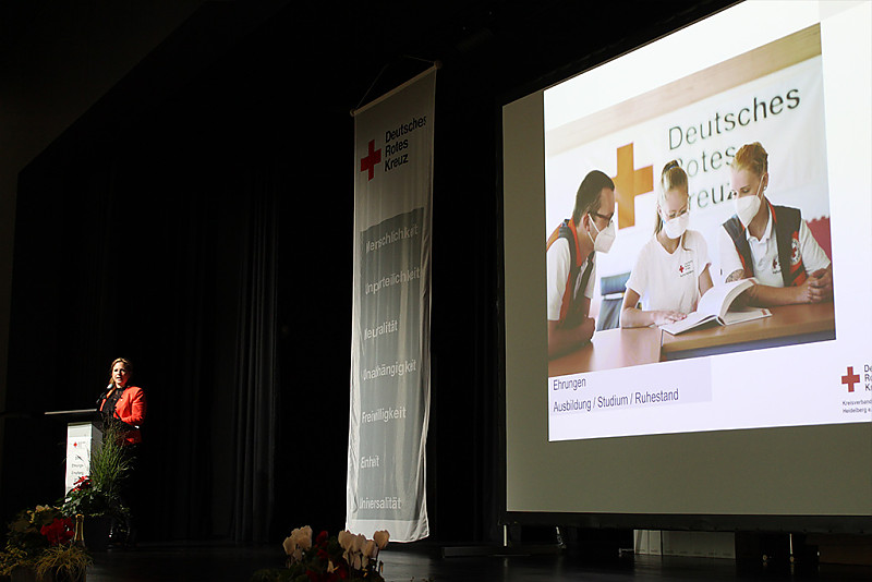 So nahmen die Einsätze während der Corona-Pandemie und bei der Hochwasserkatastrophe im Ahrtal viel Raum auf der großzügigen Bühne ein. DRK-Präsident Jürgen Wiesbeck verlas die Namen der zahlreichen Helfer, die sich in den Jahren 2020 und 2021 in Teststationen, in mobilen Impfteams, in den Impfzentren und bei der Qualifizierung von Corona-Schnelltestern verdient gemacht hatten. Er betonte, dass nicht etwa der Kreisverband, das Präsidium oder die Ortsvereinsvorsitzenden die Pandemie so erfolgreich bewältigt hätten – sondern „wir alle gemeinsam als Rotes Kreuz“. Auch DRK-Ehrenpräsident Dr. Eckart Würzner fand in seiner Videobotschaft viel lobende Worte für die Rotkreuzler. Diese hätten „maßgeblich dazu beigetragen, die Pandemie in Heidelberg und dem Rhein-Neckar-Kreis entscheidend einzudämmen“. Stellvertretend für alle Einsatzkräfte wurde der Einsatzstab des DRK-Kreisverbandes auf der Bühne geehrt. Dieser hatte bereits Anfang März 2020 die Arbeit aufgenommen und „kam in den turbulenten Zeiten zweimal täglich in Krisensitzungen zusammen“, wie Kreisbereitschaftsleiterin Yvonne Wiedl betonte.