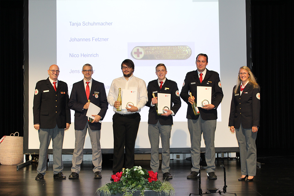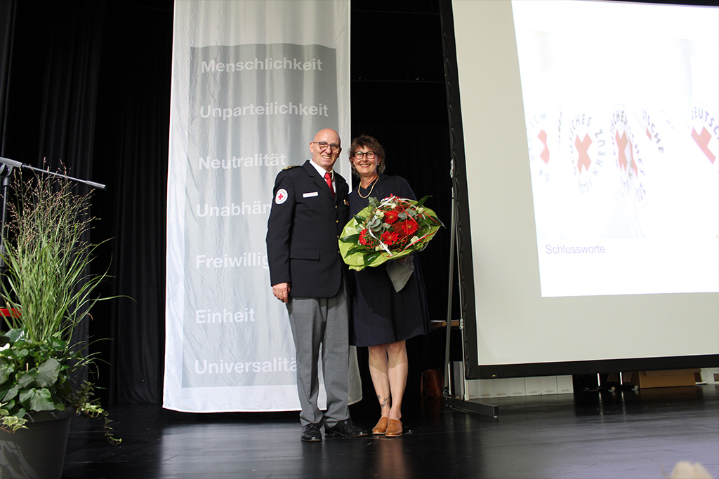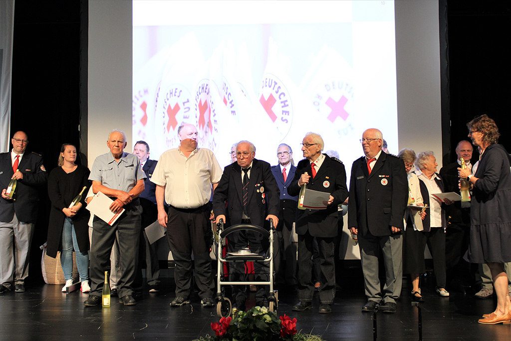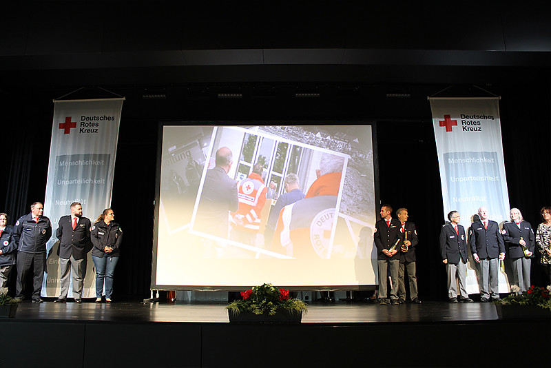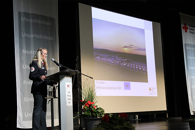 Andächtig und emotional wurde die Ehrung der Einsatzkräfte, die bei der Hochwasserkatastrophe 2021 im Ahrtal geholfen hatten. Die heftigen Eindrücke von dort waren noch sehr präsent – das Leid der Bevölkerung hatten fast alle Geehrten auf der Bühne hautnah miterlebt. Sie waren als Führungskräfte vor Ort, als Teil der Psychosozialen Notfallversorgung oder als Helfer beim Versorgungsplatz 10.000, wo die Flutgeschädigten mit warmen Mahlzeiten versorgt wurden. Dieses Engagement, für das sich nicht wenige Rotkreuzler extra Jahresurlaub nahmen, war außergewöhnlich und fand beim Ehrungsempfang endlich eine angemessene Würdigung.