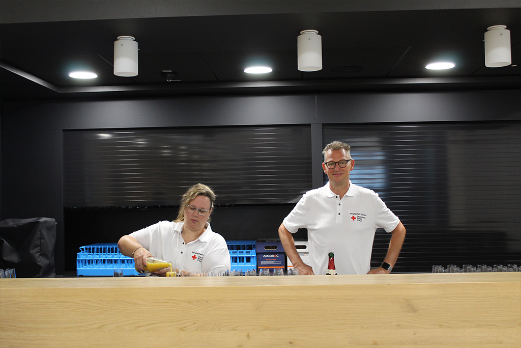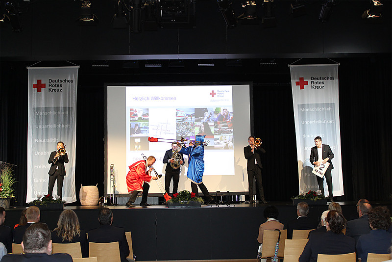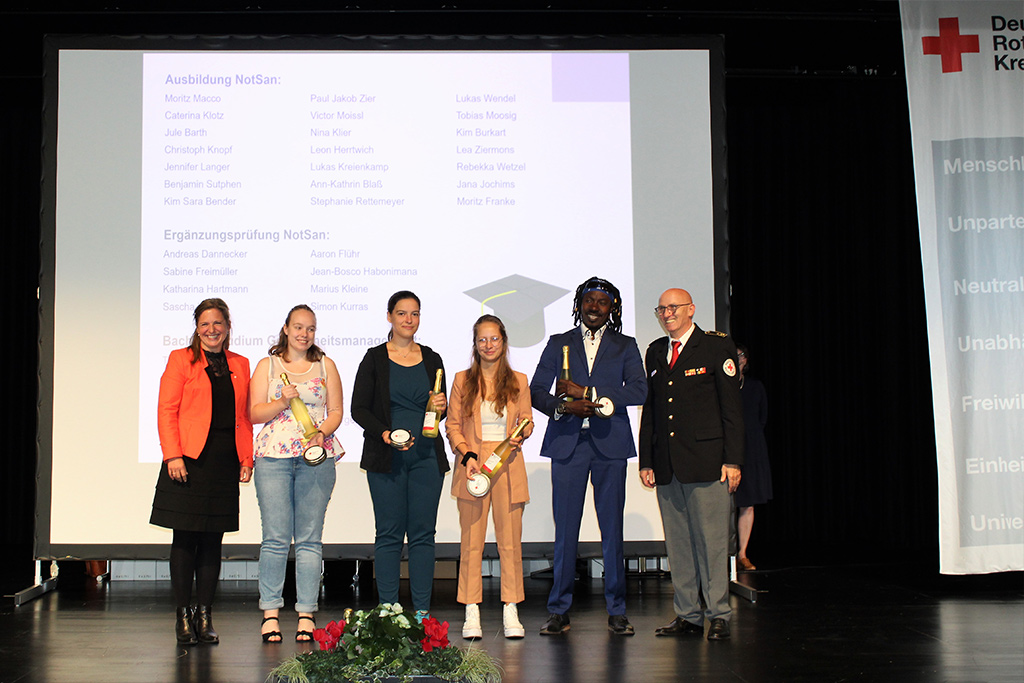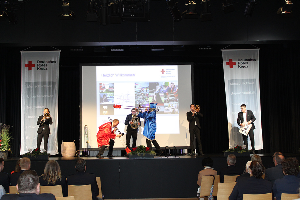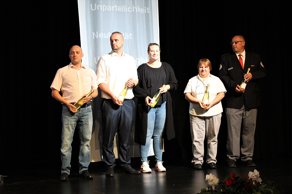Andächtig und emotional wurde die Ehrung der Einsatzkräfte, die bei der Hochwasserkatastrophe 2021 im Ahrtal geholfen hatten. Die heftigen Eindrücke von dort waren noch sehr präsent – das Leid der Bevölkerung hatten fast alle Geehrten auf der Bühne hautnah miterlebt. Sie waren als Führungskräfte vor Ort, als Teil der Psychosozialen Notfallversorgung oder als Helfer beim Versorgungsplatz 10.000, wo die Flutgeschädigten mit warmen Mahlzeiten versorgt wurden. Dieses Engagement, für das sich nicht wenige Rotkreuzler extra Jahresurlaub nahmen, war außergewöhnlich und fand beim Ehrungsempfang endlich eine angemessene Würdigung.