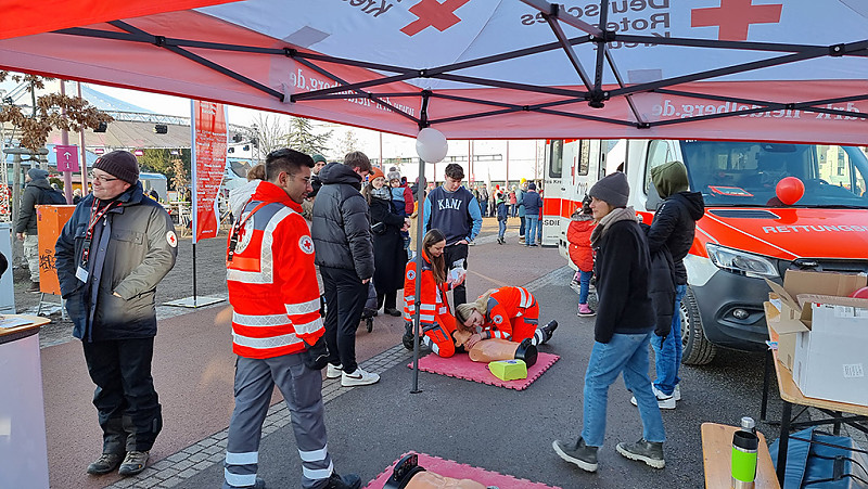 An zentraler Stelle, direkt neben der Hauptbühne vor dem Karlstorbahnhof hatte der DRK-Kreisverband einen weithin sichtbaren Stand. Hier wurden nicht nur Infomaterial und Rotkreuz-Giveaways an die Besucherinnen und Besucher verteilt, sondern auch zum Mitmachen aufgefordert: An zwei Puppen konnten diese ihre Reanimationskenntnisse vertiefen. Die Worte „zuletzt vor X Jahren beim Führerschein“ bekamen unsere Erste-Hilfe-Ausbilder*innen dabei öfters zu hören. Sie zeigten Jung und Alt, wie die Herz-Lungen-Wiederbelebung funktioniert, und was zu tun ist, wenn man eine leblose Person findet. Dass es meistens die eigenen Angehörigen oder Freunde sind, die reanimationspflichtig werden, hat viele überrascht und zum Nachdenken angeregt – einige versprachen an Ort und Stelle, bald zu einem Kurs in den großen Lehrsaal des DRK zu kommen.