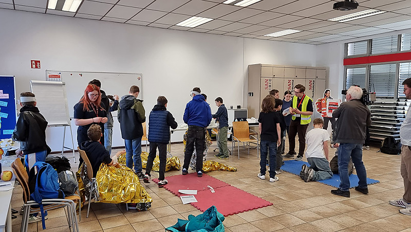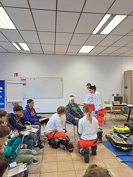 Nach der Anmeldung, einer Begrüßung der Kinder und einer ersten Information geht ein gespielter Notruf im Lehrsaal des DRK ein: Eine Frau ist auf den Kopf gestürzt – Sanitäter werden gerufen und der Rettungswagen fährt vor. Was dramatisch beginnt, ist Teil einer geplanten Übung – alle Szenarien und Handlungen werden den Kindern fortlaufend erklärt. Im Rahmen des Boys & Girls Day erleben 20 Jungen und 20 Mädchen in getrennten Gruppen hautnah, wie ein Notfalleinsatz im Zusammenspiel von Hausnotruf und Rettungsdienst abläuft – von der Erstversorgung bis zum Abtransport.