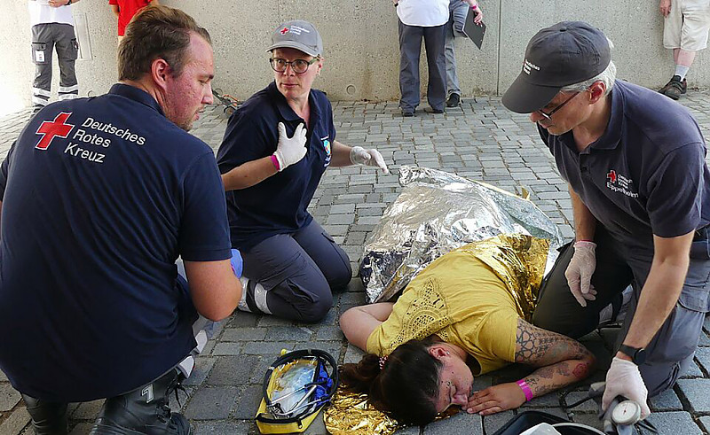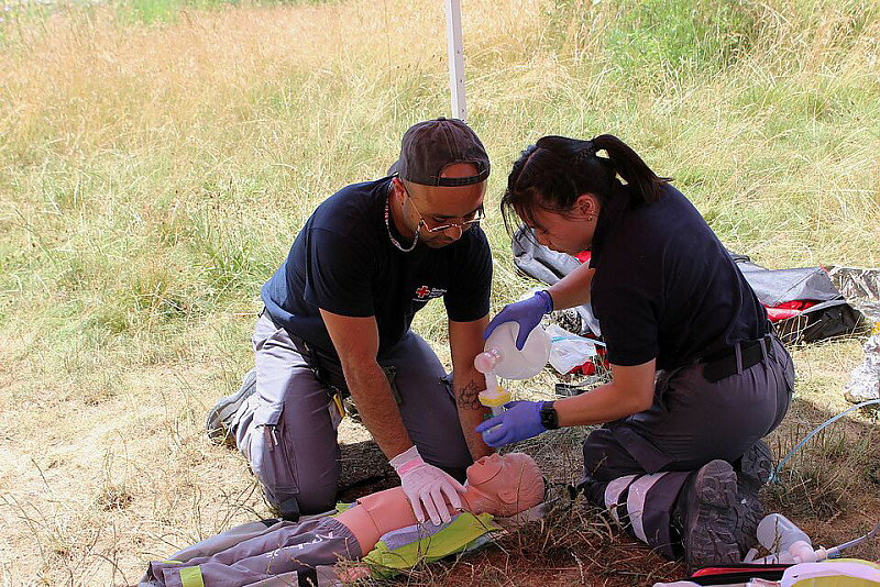 Dabei ging es unter anderem um solche Fragstellungen: Wie gehe ich mit einem Herzinfarkt um, wie reanimiere ich einen Patienten oder wie verhalte ich mich bei einem Unfall oder einem allergischen Schock? Wertungsrichter wachten über die Leistungen. Bei hochsommerlichen Temperaturen mussten die Teams in mehr als 5 Stunden einen anspruchsvollen Wettbewerb durchlaufen, der ihnen ihr ganzes Können abverlangte.